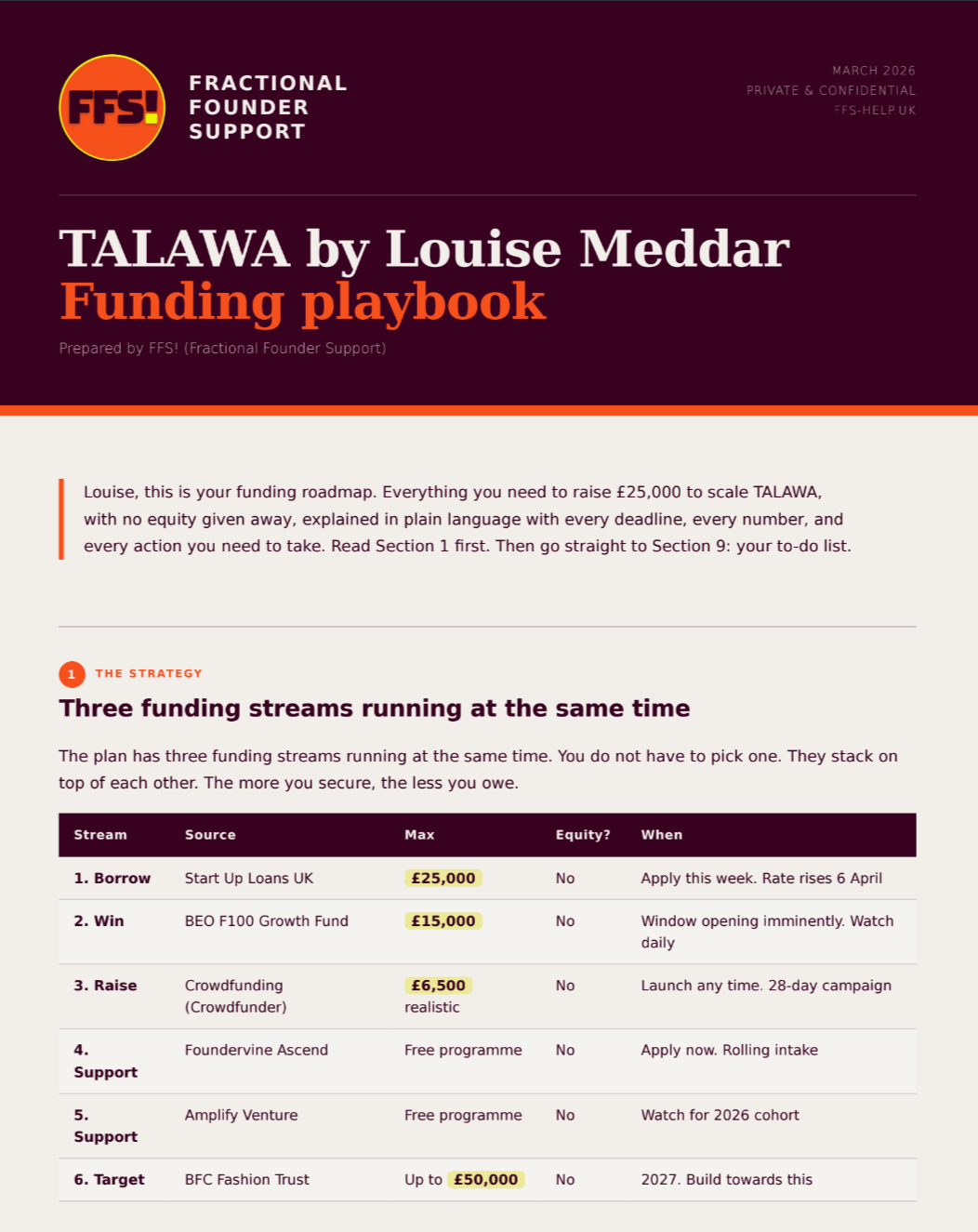 Every funding option researched in depth. The full funding playbook delivered: scenario options, where to apply, in what order, what to say, what it unlocks.